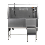 - The tub comes fully equipped with a faucet, elevated overhead grooming arm, storage basket, alloy sprayer, soft hose, restraint loops, dog fixture ring, sprayer holder, anti-slippery bottom mat, puppy booster, hair-catching drainage system, waste pipe, and more.