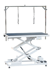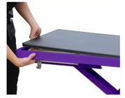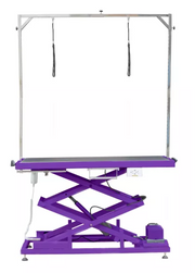 The new purple pro and pearl pro electric lift accordion grooming tables are our response to the groomer's desires. This pet grooming table lifts from 12" to 50" and has a loading capacity of 250lbs. This is the perfect table for tall groomers!! Lift the table from both sides with the new easy lift remote. Pedals on one side and a movable remote on the other side.