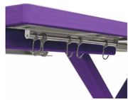 One the right side, the purple pro electric lift grooming table has several hooks, making it easy to hang the towels and tools that you need within arms length while grooming.