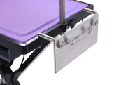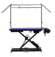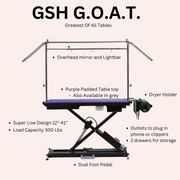 We are proud to introduce the first of its kind. The GSH G.O.A.T (Greatest Of All Tables) is built on X frame table provided increased sturdiness and higher weight capacity of 300lbs. The table lowers down to 12" and raises up to 41". It comes standard with DUAL FOOT PEDALS. It has a 15a outlet built into the table to charge your cordless clippers or your phone. It is able to run a small dryer off this table as long as it is under 15a. There are 2 drawers on this table to help minimalize clutter on your grooming table.